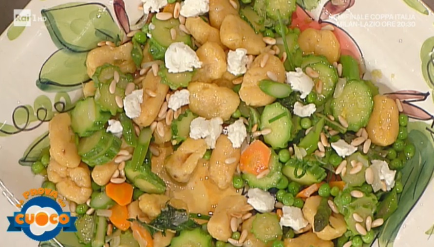 Cuociamo gli gnocchi in acqua bollente e salata. Quando vengono a galla, li scoliamo con una schiumarola. Li saltiamo in padella con le verdure rosolate. Finiamo con delle zeste di limone, i pinoli tostati ed il caprino fresco, che mettiamo in fiocchi, prima di servire.