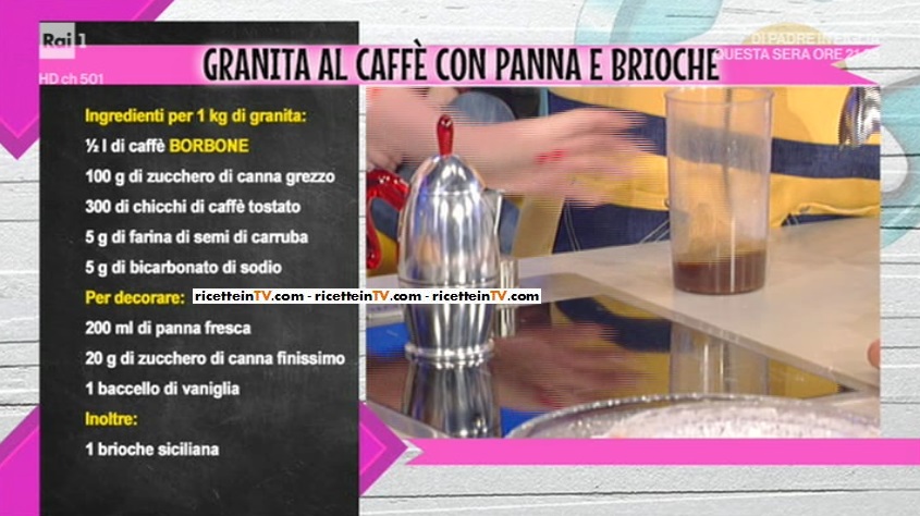 - Per 1 Kg di granita: mezzo l di caffè, 100 g zucchero di canna, 300 g chicchi di caffè tostato, 5 g farina di semi di carrube, 5 g bicarbonato di sodio