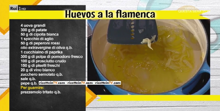 - 4 uova grandi, 300 g patate, 50 g cipolla bianca, 1 spicchio d’aglio, 50 g peperoni rossi, olio evo, 1 cucchiaino di paprika, 300 g polpa di pomodoro fresco, 100 g prosciutto crudo, 150 g piselli freschi, 20 g vino bianco, zucchero semolato, sale e pepe