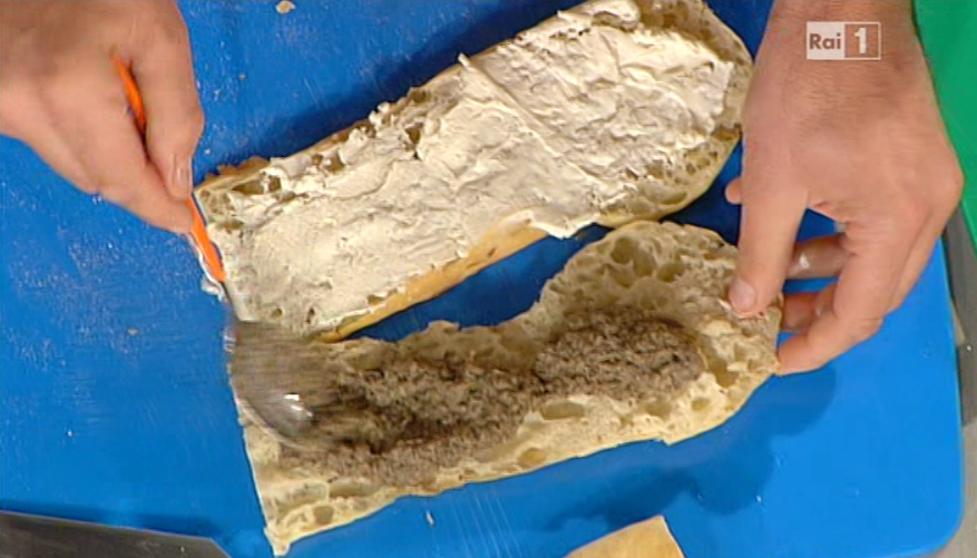 “Vado a mangiare qualche panino!“, Antonella corre da Cristian Milone, il paninaro, che prepara un primo panino con crema di melanzana e caprino.