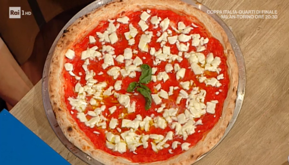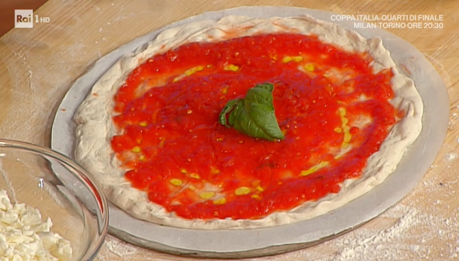 Stendiamo i panetti lievitati con le mani, lasciando i bordi più alti. Condiamo con salsa di pomodoro, basilico, olio evo e fiordilatte tritato. Cuociamo in forno caldo e statico a 230° per 15 minuti.