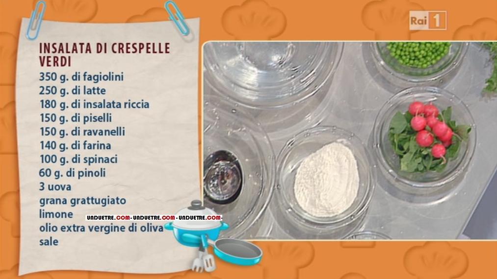 Vi proponiamo una gustosa ricetta realizzata in una delle ultime edizioni de La prova del cuoco. Antonella è pronta a danzare sulle note di un romantico passo a due con Sergio Barzetti, prima di cucinare, insieme al cuoco. Oggi i due preparano l’insalata di crespelle verdi. Iniziamo dagli ingredienti.