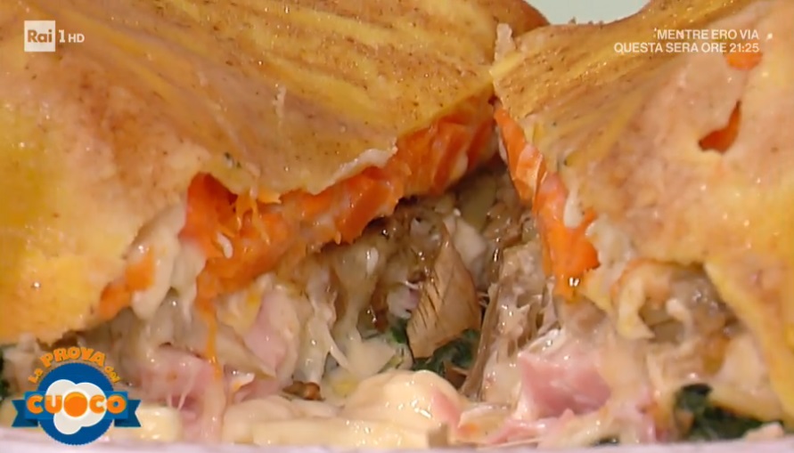 Imburriamo e spolveriamo con pangrattato una tortiera dai bordi alti. Copriamo i bordi ed il fondo con le lasagne, facendole strabordare ai lati. Sul fondo distribuiamo la zucca spadellata, il gorgonzola a fiocchi, del formaggio grattugiato ed un po’ di besciamella. Copriamo il primo strato con le lasagne scottate, quindi passiamo al secondo strato. Mettiamo gli spinaci saltati, lo stracchino stracciato con le mani, formaggio grattugiato ed un po’ di besciamella. Copriamo con la pasta all’uovo. Lo strato successivo si compone dei carciofi spadellati, della fontina a cubetti, del formaggio grattugiato ed un po’ di besciamella. Copriamo con la pasta e formiamo l’ultimo strato con mortadella affettata e caciocavallo sbriciolato con le mani. Richiudiamo i bordi sul ripieno e spolveriamo con formaggio grattugiato. Cuociamo in forno preriscaldato a 180° per 45 minuti.