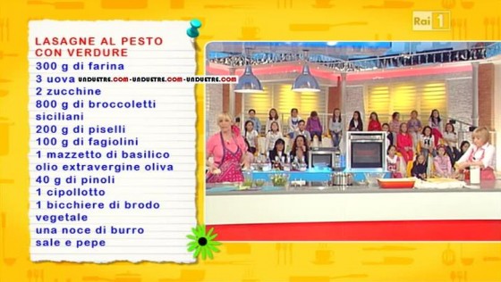 Vi proponiamo una gustosa ricetta realizzata in una delle ultime edizioni de La prova del cuoco. Corriamo subito da una canterina Annina, pronta a proporre la sua ricetta della domenica. Stonata come una campana, Anna canticchia Domenica è sempre domenica, interrompendosi per annunciare la sua ricetta: lasagne al pesto e verdure.