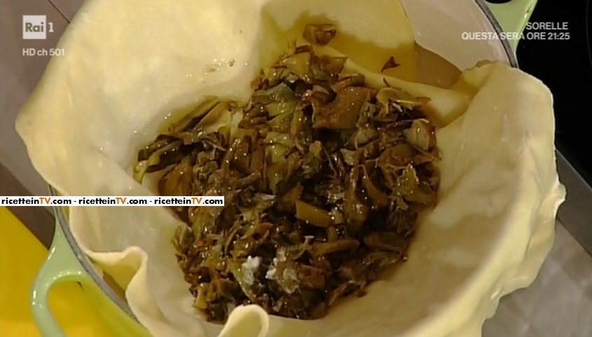 - 3 uova, 300 g farina 0, 6 carciofi, 1 spicchio d’aglio, 500 g ricotta, 100 g montasio, 50 g formaggio grattugiato, un mazzo di prezzemolo, olio evo, sale e pepe