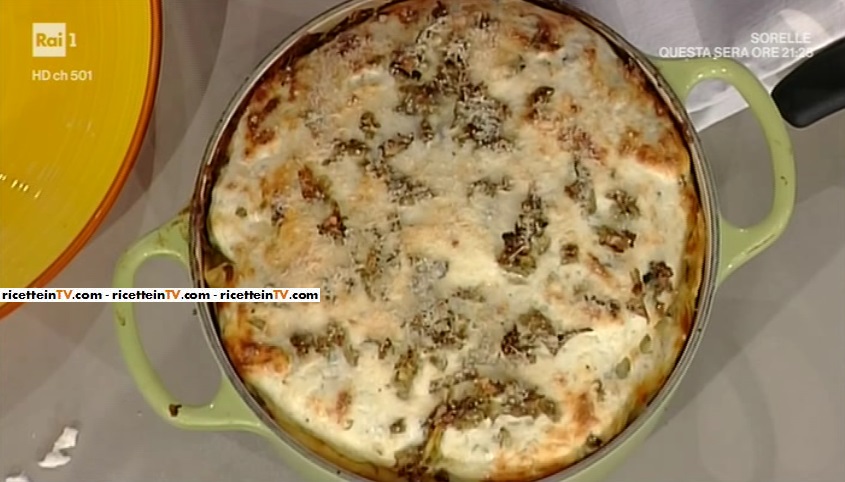 Montiamo la lasagna: imburriamo un tegame, ovvero, una pentola che va in forno. Alla base mettiamo una cucchiaiata di composto di ricotta. Mettiamo una sfoglia di pasta, che deve coprire anche i bordi. Formiamo uno strato di carciofi, uno di crema di ricotta ed un’altra sfoglia di pasta. Formiamo un altro strato di carciofi e crema. Proseguiamo fino ad esaurire gli ingredienti. Finiamo con uno strato di pasta, crema di ricotta e qualche carciofo. Spolveriamo con formaggio grattugiato. Inforniamo a 200° per 20 minuti, abbassiamo a 180° fino a doratura (circa 10 minuti). Una volta spento il forno, lasciamo riposare ancora 10 minuti in forno e serviamo.