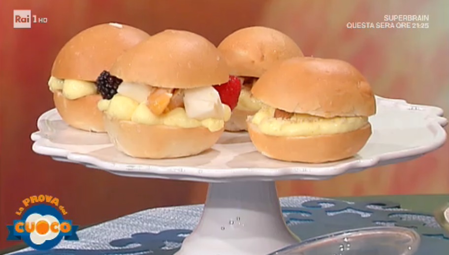 Tagliamo a metà dei panini al latte o olio morbidi. Spennelliamo ciascuna metà con del succo di mela. Farciamo con della crema pasticcera classica e dei cubetti di pera, mandarino e frutti di bosco freschi. Richiudiamo il panini ed è pronto. Possiamo inzuppare le due metà del panino con del caffè, quindi farciamo con ciuffi di crema bianca e al cioccolato (alternando); richiudiamo. Terzo panino: inzupiamo il panino con del vin santo, quindi farciamo con crema classica e cantucci o mandorle sbriciolate e intere. Infine, bagniamo il pane con succo di mela, quindi farciamo con crema, mele a cubetti e cannella.