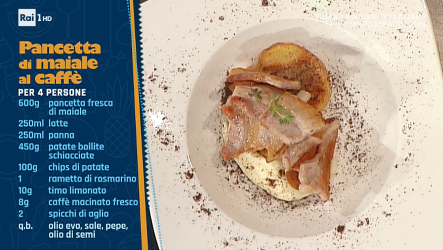 Sul piatto, formiamo un letto di purea di patate. Spolveriamo con del caffè in polvere ed adagiamo sopra la pancetta ben dorata a pezzetti. Finiamo con delle chips di patate.