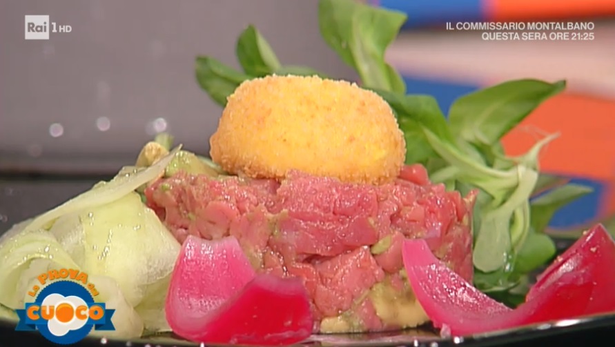 Sul piatto, formiamo un letto di tartare (che inseriamo in un coppapasta). Adagiamo sopra il tuorlo fritto, quindi completiamo con petali di cipolla, cotti in acqua e aceto bianco, cetrioli affettati sottili e conditi con olio e sale.