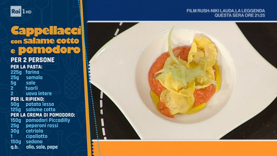 • Lunedì – “duello delle città” tra la sfoglina delle sfogline, Alessandra Spisni, e la conduttrice televisiva Roberta Capua. Poi sarà la volta dello chef stellato Marco Bottega, che metterà alla prova Elisa Isoardi. Dopo la ricetta di Alessandra Spisni, spazio ad una fantasiosa torta salata della mamma cuoca Natalia Cattelani.