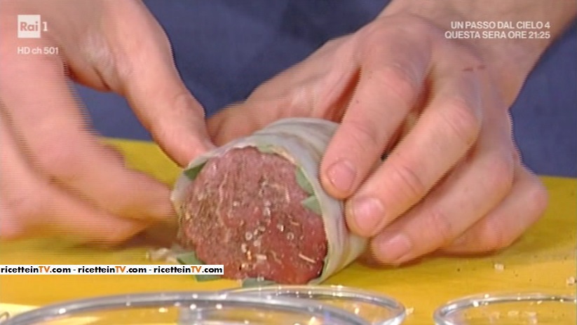 Disponiamo delle fettine di guanciale una accanto all’altra. Le copriamo con delle foglioline di salvia fresca. Arrotoliamo il medaglione di manzo con il guanciale e la salvia e fermiamo il tutto con dello spago. Saliamo la carne con sale grosso.