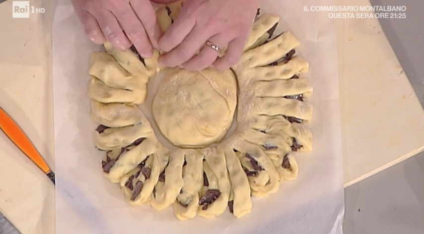 Al centro mettiamo la palla di composto tenuta da parte, che prima farciamo con altri pezzetti di cioccolato. Tagliamo i bordi a fettine, che rigiriamo leggermente per dare il senso della margherita. Spennelliamo con uovo sbattuto sulla palla al centro e spolveriamo con granella di zucchero. Lasciamo lievitare ancora mezz’ora, quindi inforniamo per 20 minuti a 180°. Buon appetito.