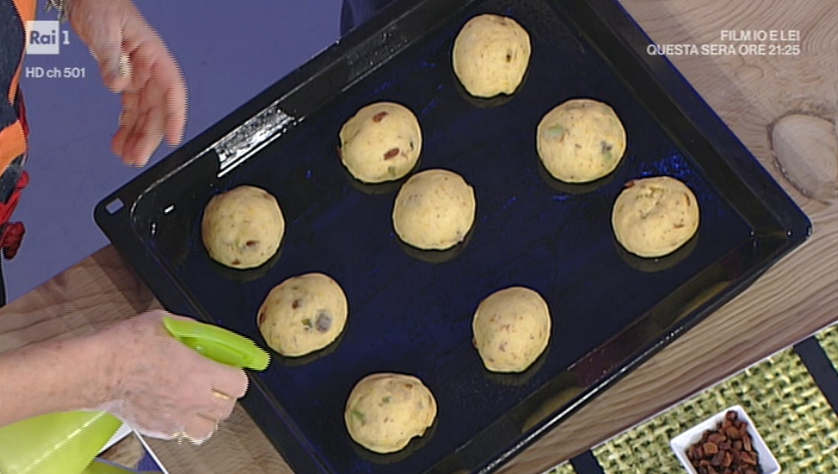 Su un piano, disponiamo le farine, 00 e manitoba, a fontana. Al centro mettiamo l’olio e le uova intere. Impastiamo aggiungendo pian piano la miscela di latte e lievito. Ad impasto quasi formato, aggiungiamo le uvette infarinate per bene e gli aromi (cedro, arancia e zucchero). Dopo qualche minuto di impasto, ottenuto un composto liscio ed omogeneo, mettiamo quest’ultimo in una ciotola a lievitare, coperto con della pellicola, per 2-3 ore circa.