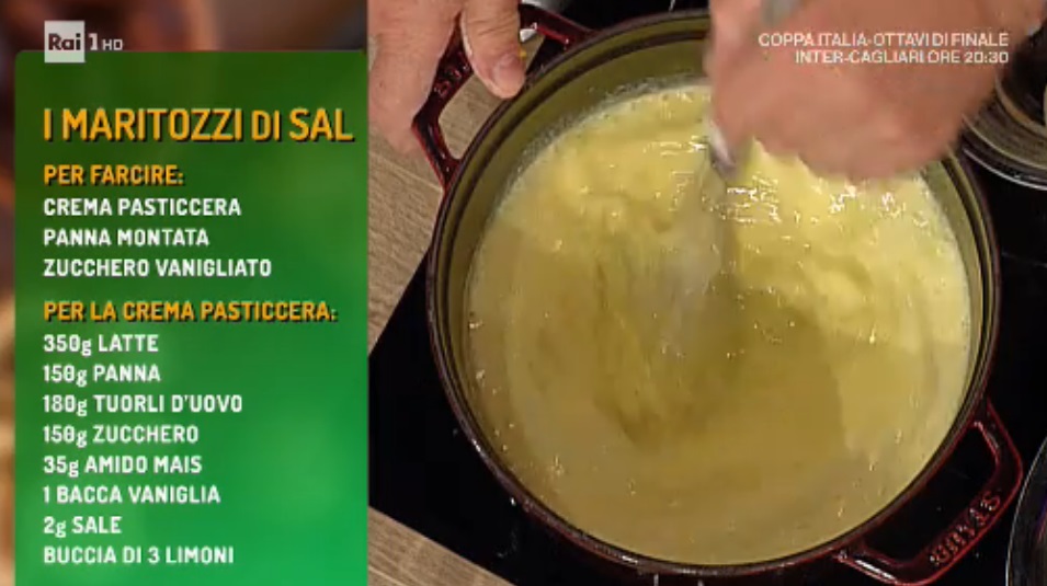 - Crema pasticcera: 350 g latte, 150 g panna, 180 g tuorli, 150 g zucchero, 35 g amido di mais, vaniglia, 2 g sale, buccia di 3 limoni