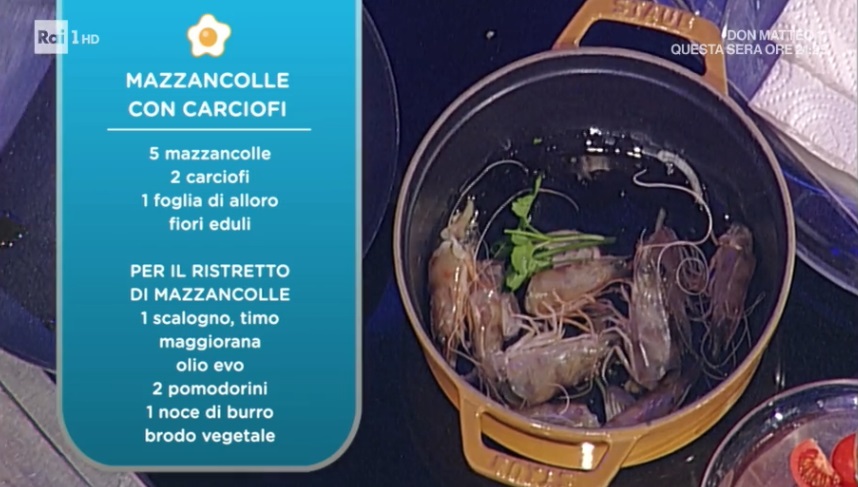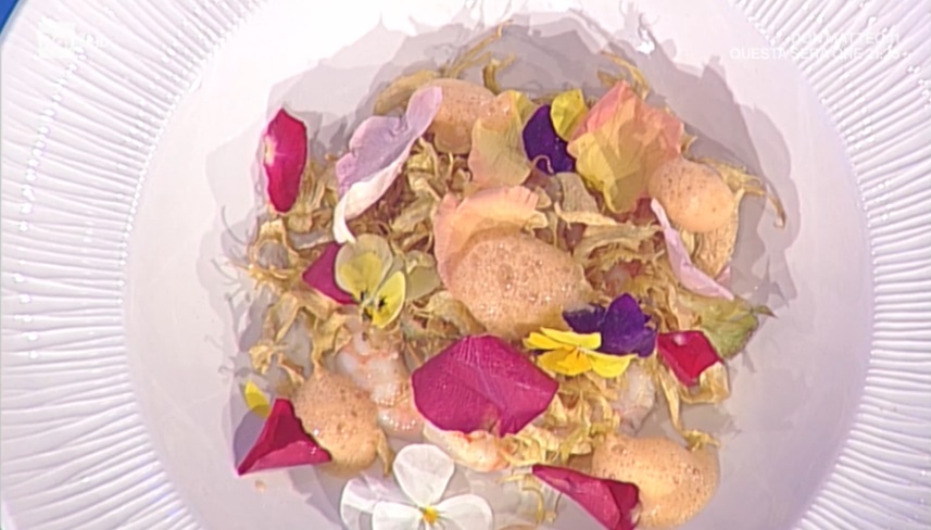- Ristretto di mazzancolle: 1 scalogno, timo, maggiorana, olio evo, 2 pomodorini, 1 noce di burro, brodo vegetale