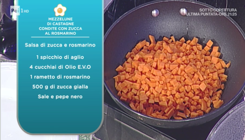 - Salsa di zucca: 1 spicchio d’aglio, 4 cucchiai di olio evo, 1 rametto di rosmarino, 500 g zucca gialla, sale e pepe