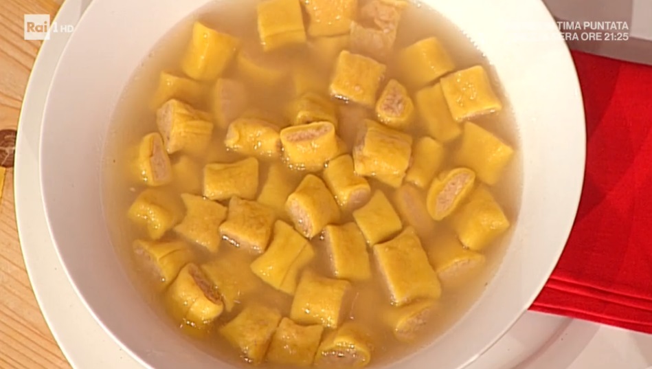 Formiamo un salsicciotto di ripieno e lo adagiamo sulla sfoglia. Arrotoliamo la sfoglia sul ripieno, in modo da coprirlo completamente. Tagliamo via l’eccesso di sfoglia (foto). A questo punto, tagliamo a tocchetti i salsicciotti ottenuti e li tuffiamo nel brodo bollente. Facciamo bollire per 1 minuto e serviamo.