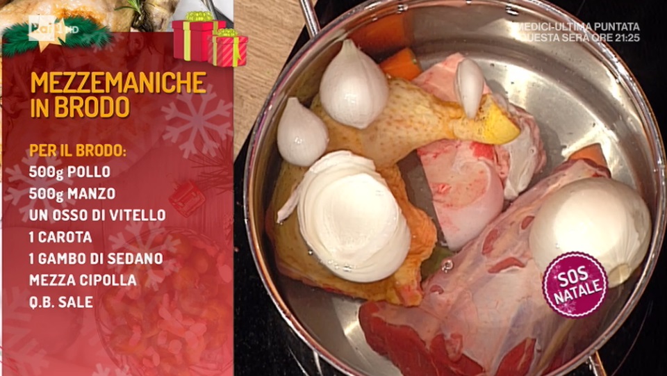 - Brodo: 500 g pollo, 500 g manzo, 1 osso di vitello, 1 carota, 1 gambo di sedano, mezza cipolla, sale