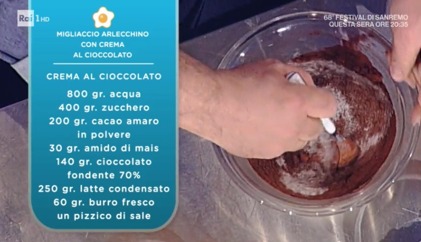 - Crema al cioccolato: 800 g acqua, 400 g zucchero, 200 g cacao amaro in polvere, 30 g amido di mais, 140 g cioccolato fondente 70%, 250 g latte condensato, 60 g burro, un pizzico di sale