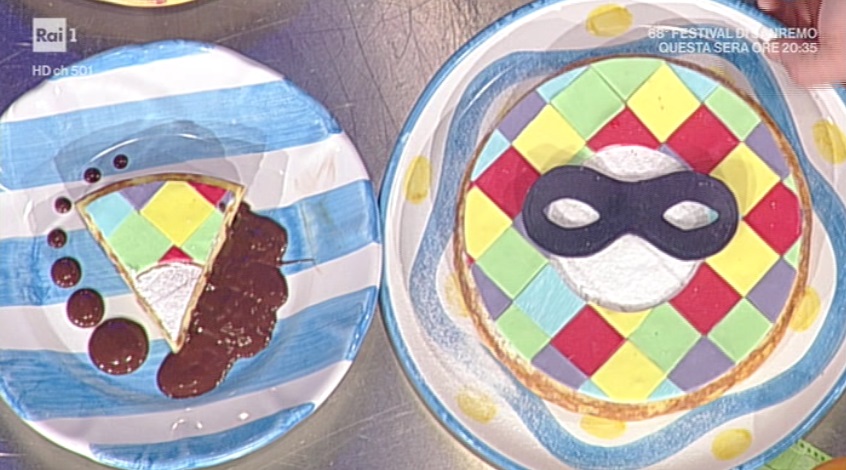 Possiamo decorare il migliaccio ormai freddo con dei triangoli colorati di pasta di zucchero, a ricreare il costume di Arlecchino. Serviamo con la crema al cioccolato.