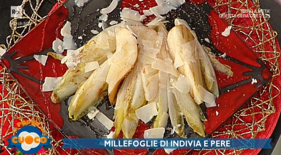 Componiamo: su un piatto spolverato di noce moscata, adagiamo l’indivia brasata, formiamo sopra uno strato di pera, un filo di miele e scaglie di formaggio stagionata. Continuiamo e terminiamo con il formaggio.