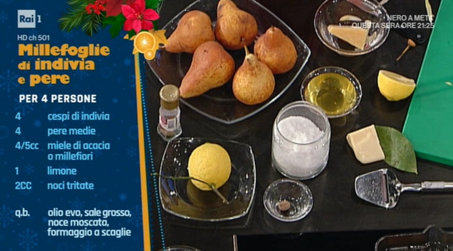 - 4 cespi di indivia, 4 Pere medie tipo Kaiser mature ma ben sode, 4-5 cucchiaiate di miele tipo acacia o millefiori, 1 limone, Olio E.V.O., sale grosso, noce moscata, formaggio stagionato a scaglie