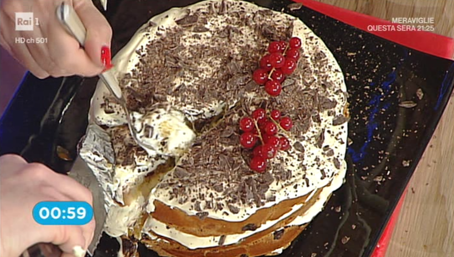 Spalmiamo sul primo disco di panettone un velo di marmellata. Formiamo sopra uno strato di crema al mascarpone e finiamo con riccioli o scaglie di cioccolato fondente. Sovrapponiamo un altro disco di panettone e farciamo come sopra. Proseguiamo fino a raggiungere l’altezza voluta o esaurire la crema. Finiamo con crema e scaglie di cioccolato. Lasciamo riposare in frigorifero 1 o 2 ore prima di servire. Decoriamo con ribes.