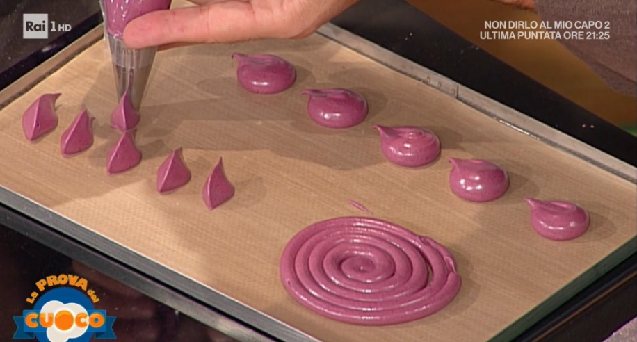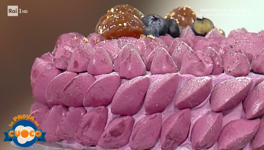 - Meringa ai mirtilli neri: 150 g di purea di mirtilli neri, 225 g di zucchero semolato, 10 g di albumina, 150 g di zucchero a velo