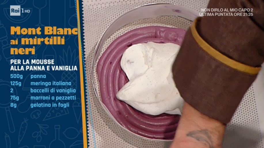 Alla base di un anello, mettiamo un disco di meringa ai mirtilli secca. Copriamo con uno strato di mousse. Creiamo sopra una spirale di crema di marroni (già pronta; si trova al supermercato). Copriamo con un altro strato di mousse. Inseriamo un secondo disco di meringa e copriamo con la mousse rimasta, fino all’orlo dell’anello. Livelliamo e congeliamo.