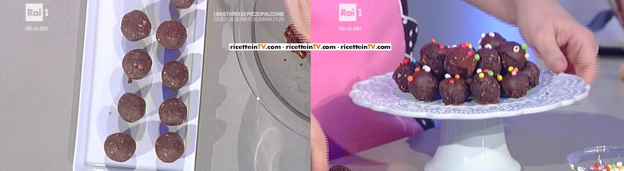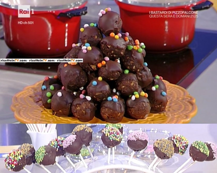 Con l’impasto, formiamo delle palline della grandezza desiderata. Le mettiamo in freezer, in modo che si induriscano. Immergiamo ciascuna sfera nel cioccolato fuso. Decoriamo con zuccherini colorati, quindi disponiamo su un piatto, in modo da formare una piramide. In alternativa, infilziamo le sfere con degli stecchi, che intingiamo nel cioccolato fuso e decoriamo con gli zuccherini.