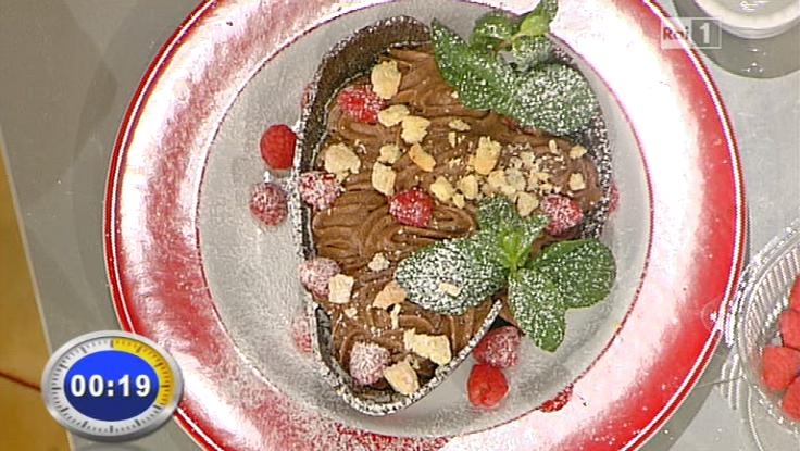 Nella puntata odierna de La prova del cuoco, nel segmento finale, dedicato alla gara tra cuochi, Cristian Bertol ha proposto la mousse al cioccolato con granella di biscotto e lamponi.