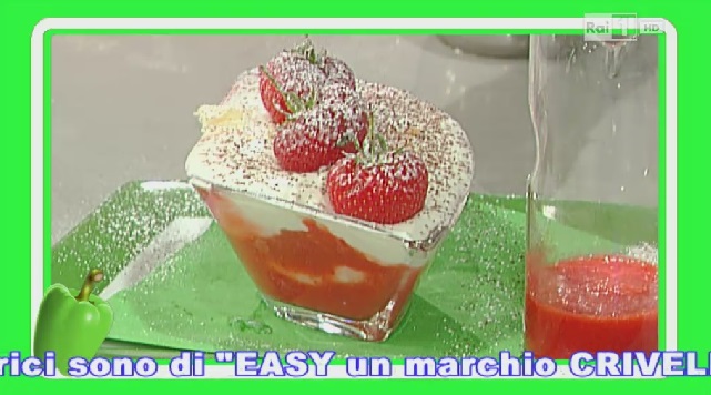 Nella puntata odierna de La prova del cuoco, nel segmento finale, dedicato alla gara tra cuochi, la squadra verde con Natale Giunta prepara la mousse allo yogurt con biscotto di sfoglia e fragole.