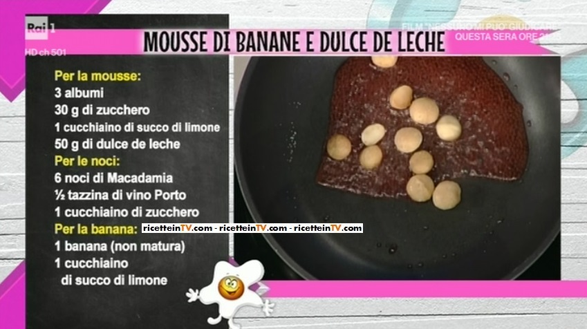 In una coppa, mettiamo la mousse. Adagiamo sopra delle fettine di banana. Copriamo con altra mousse. Completiamo con le noci caramellate e delle foglioline di menta.