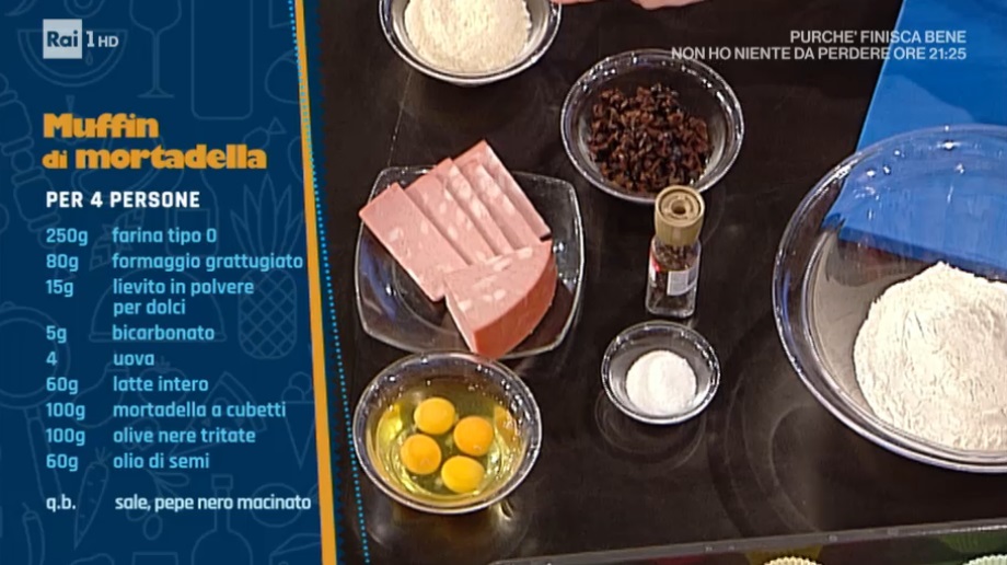 - Per 18-20 muffin: 250 g farina 0, 80 g formaggio grattugiato, 15 g lievito istantaneo, 5 g bicarbonato, 4 uova, 60 g latte intero, 100 g mortadella a cubetti, 100 g olive nere tritate, 60 g olio di semi, sale, pepe nero