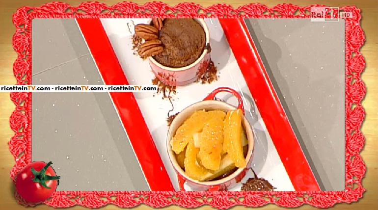 - 80 g di burro, 100 g di cioccolato fondente, 70 g di farina, ½ bustina di lievito, 2 uova, 100 g di zucchero, 200 g di latte, 100 g di noci pecan, 2 pere, 1 arancia