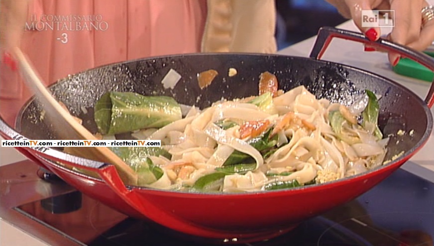 - 300 g di noodles di riso, 3 cucchiai di olio evo, 1 spicchio di aglio, 1 carota, 250 g di gamberetti, 1 uovo intero, 2 cucchiai di salsa di soia dark thai, 2 cucchiai di salsa di ostriche, 3-4 ciuffi di Kai Lan (o coste di bietole o pak choi)