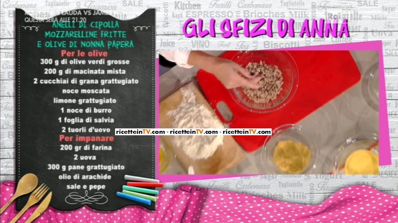 Anna Moroni si toglie lo sfizio… anche oggi, la sapiente cuoca prepara uno dei suoi ‘sfizi‘, una golosissima fantasia di fritti, comprendente le classiche mozzarelline, le finte olive ascolane e gli anelli di cipolla. Ecco la ricetta delle olive di nonna papera.