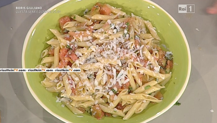 Peliamo e tagliamo a cubetti i pomodori verdi rosati, o cuori di bue. Tritiamo finemente basilico, prezzemolo e maggiorana (e se vogliamo dell’aglio). Condiamo il pomodoro con le erbe aromatiche tritate, olio sale e pepe. Lasciamo macerare per 1 oretta, fuori dal frigorifero. Lessiamo le orecchiette o le penne in acqua salata. Le scoliamo e le passiamo sotto l’acqua fredda corrente. Condiamo con il pomodoro e della ricotta salata grattugiata al momento. Se serve, condiamo con olio a crudo.