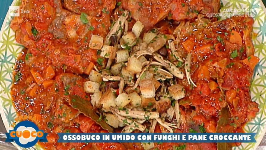 Infine, il secondo piatto delle feste, bandiera della cucina lombarda. Emilio Signori, il macellaio toscano, prepara l’ossobuco in umido con funghi e pane croccante.