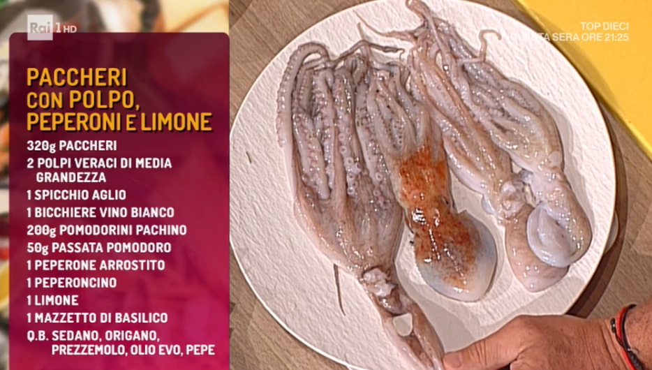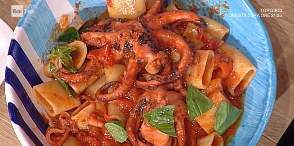 paccheri con polpo e peperoniIl trittico del venerdì si ricompone. Gli affezionati de La prova del cuoco sanno che, nelle varie edizioni, ad augurarci un buon fine settimana sono stati, tradizionalmente, Pascucci, Bonci e De Riso. Il primo, direttamente da Fiumicino, prepara i paccheri con polpo e peperoni.