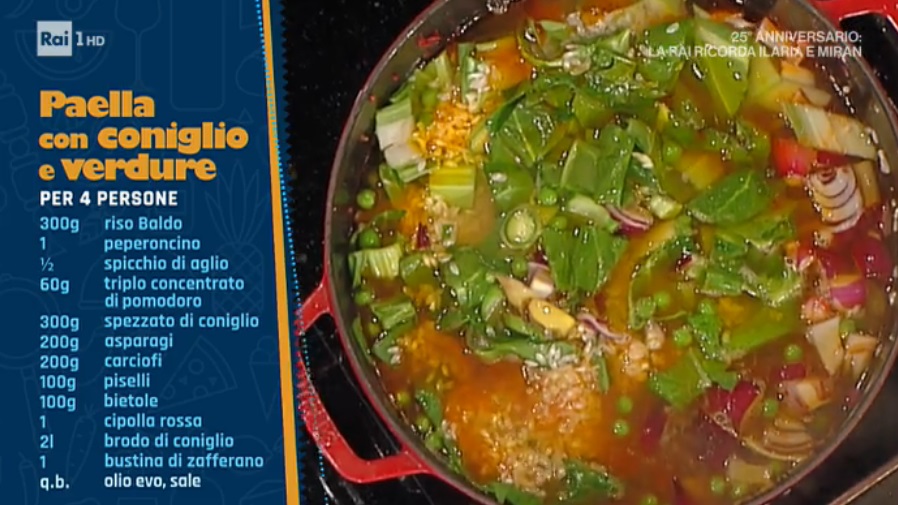 - 300 g riso Baldo, 1 peperoncino, mezzo spicchio d’aglio, 60 g triplo concentrato di pomodoro, 300 g spezzato di coniglio, 200 g asparagi, 200 g carciofi, 100 g piselli, 100 g bietole, 1 cipolla rossa, 2 l brodo di coniglio, 1 bustina di zafferano, olio, sale
