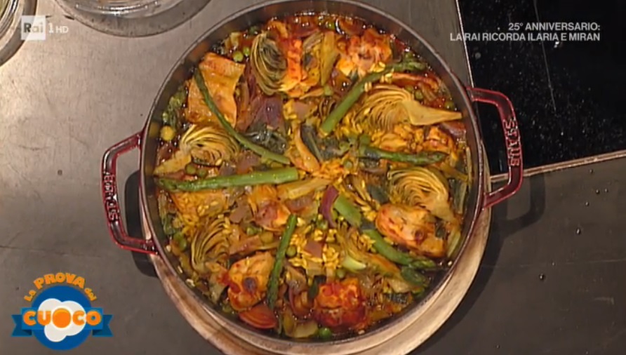 A chiudere il menu di oggi il piatto unico di Diego Bongiovanni, autore di una versione nostrana di un classico della cucina spagnola, la paella. Ecco, quindi, la paella di coniglio e verdure.