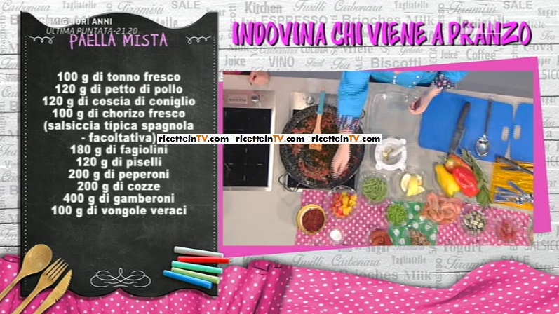 - 100 g tonno fresco, 120 g petto di pollo, 120 g coscia di coniglio, 100 g chorizo fresco (salsiccia spagnola – facoltativa), 180 g fagiolini, 120 g piselli, 200 g peperoni, 200 g cozze, 400 g gamberoni, 100 g vongole veraci, 120 g olio evo, 150 g passata di pomodoro, 2 spicchi di aglio, 400 g riso Bomba o Arborio, 1 l brodo di pesce, zafferano, 2 peperoni secchi spagnoli – facoltativi, 25 g sale, 150 g calamari, 80 g mazzancolle sgusciate