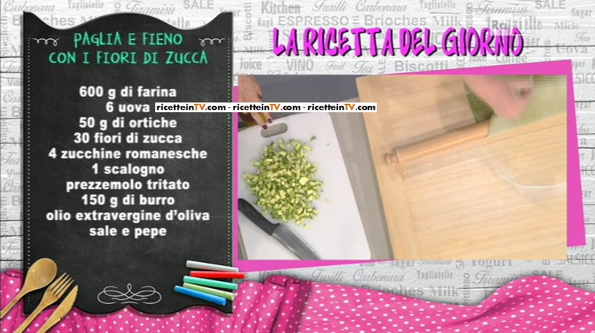 - 600 g farina, 6 uova, 50 g ortiche, 30 fiori di zucca, 4 zucchine romanesche, 1 scalogno, prezzemolo tritato, 150 g burro, olio evo, sale e pepe