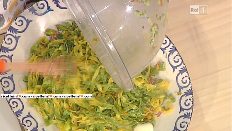 Prepariamo le due sfoglie, impastando le uova con la farina; a metà impasto, però, aggiungiamo anche le ortiche sbollentate e frullate finemente. Lasciamo riposare, quindi stendiamo le due sfoglie, gialla e verde. In padella, scaldiamo l’olio e metà del burro. Mettiamo ad appassire le zucchine a cubetti; priviamo i fiori di zucca del pistillo, quindi li tagliamo a rondelle e li uniamo in padella poco prima di completare la cottura delle zucchine. In una ciotola, mettiamo il burro restante ed uniamo il condimento ancora caldo; mescoliamo in modo da sciogliere completamente il burro. Sovrapponiamo la sfoglia verde a quella gialla, che abbiamo infarinato e fatto asciugare un po’ all’aria; arrotoliamo (evitando che le due sfoglie aderiscano troppo) e tagliamo le tagliatelle. Le cuociamo in acqua bollente e salata per pochi istanti; scoliamo e condiamo col condimento; completiamo con prezzemolo tritato e formaggio grattugiato.