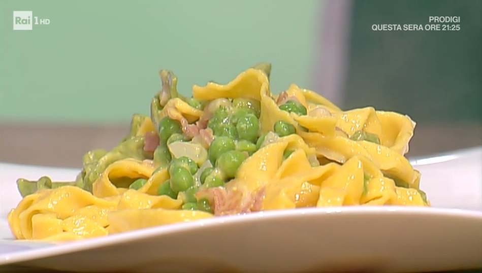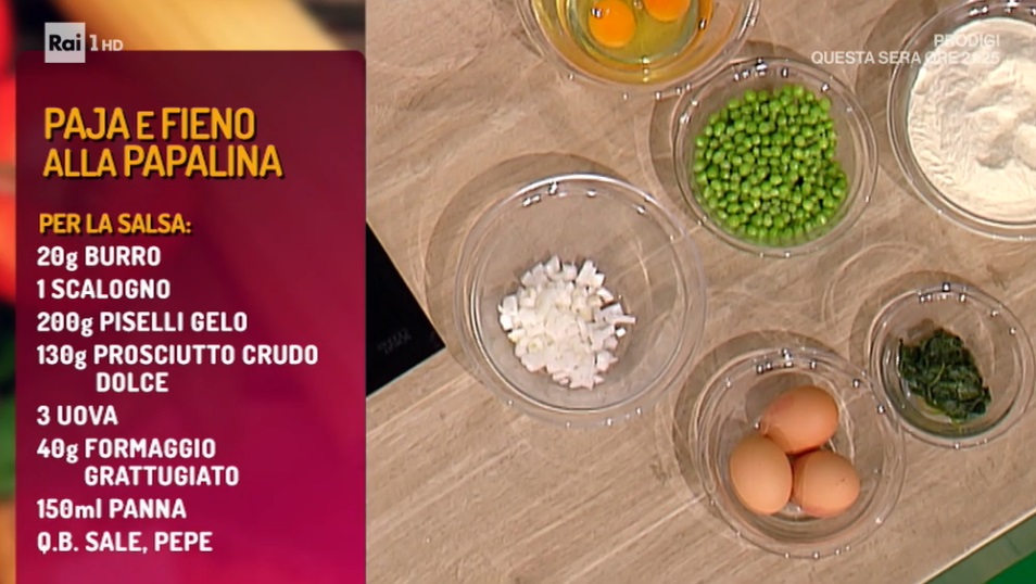 - Salsa: 20 g burro, 1 scalogno, 200 g piselli gelo, 130 g prosciutto crudo dolce, 3 uova, 40 g formaggio grattugiato, 150 ml panna, sale e pepe