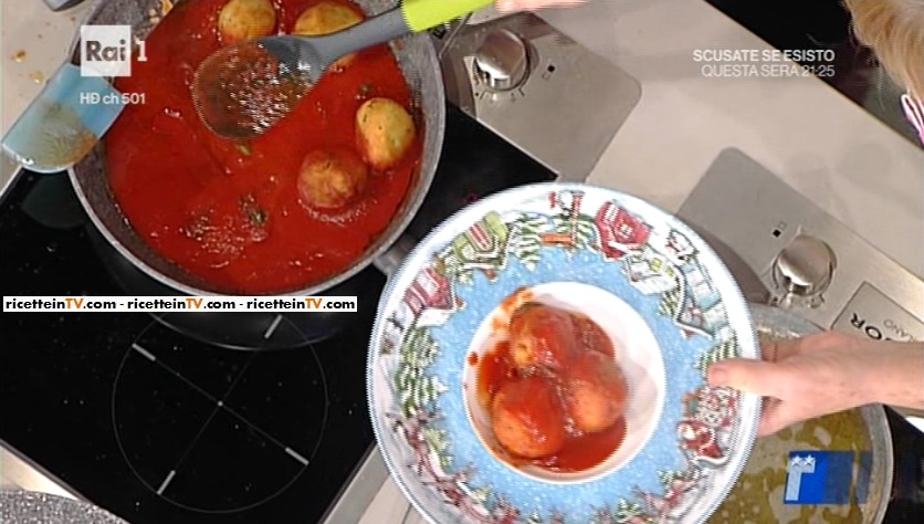 Per le polpette, mescoliamo il formaggio grattugiato misto al pane ammollato nel latte e ben strizzato. Aggiungiamo le uova e del prezzemolo tritato. Aggiustiamo di sale. Amalgamiamo. Con l’impasto ottenuto, che dev’essere ben sodo, formiamo delle polpette, che friggiamo in olio a temperatura (circa 170°). Quando sono ben dorate, le facciamo sgocciolare su carta assorbente e le tuffiamo nel sugo di pomodoro.