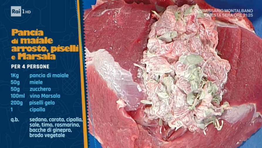 - 1 Kg pancia di maiale, 50 g miele, 50 g zucchero, 100 ml Marsala, 200 g piselli gelo, 1 cipolla, sedano, carota, cipolla, sale, timo, rosmarino, bacche di ginepro, brodo vegetale
