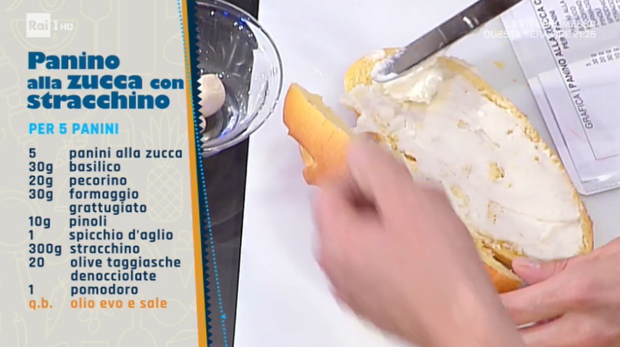 - 5 panini alla zucca, 30 g basilico, 20 g pecorino, 30 g formaggio grattugiato, 10 g pinoli, 1 spicchio d’aglio, 300 g stracchino, 20 olive taggiasche denocciolate, 1 pomodoro, olio e sale