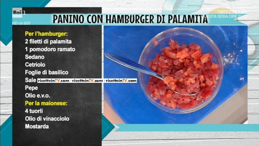 - Per l’hamburger: 2 filetti di palamita, 1 pomodoro ramato, sedano, cetriolo, foglie di basilico, sale e pepe, olio evo